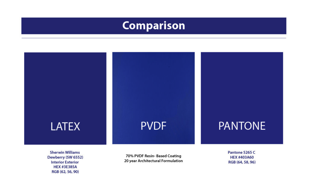 Color matching for exterior grade architectural coatings used on products like aluminum composite material (MCM wall cladding) can be quite challenging when dealing with blues, reds, vibrant, and exotic colors. In order to achieve that perfect match for a unique Purple or other deep vivid color, the result may be that no exterior warranty can be offered. So, keeping the desired performance warranty in mind as a “must-have”, there will be limitations to which primer, resin, and pigment combinations can be used. Therefore, the resulting color match may be duller, or skew more towards another color hue than the control sample. Finally, when considering that Purple and Magenta are perceived colors, essentially created by our brains, an even greater layer of complexity is involved. So even though the paint manufacturer will do their best to match these types of colors, the result may not be a 100% match due to a combination of UV requirements, raw material limitations, and science.
