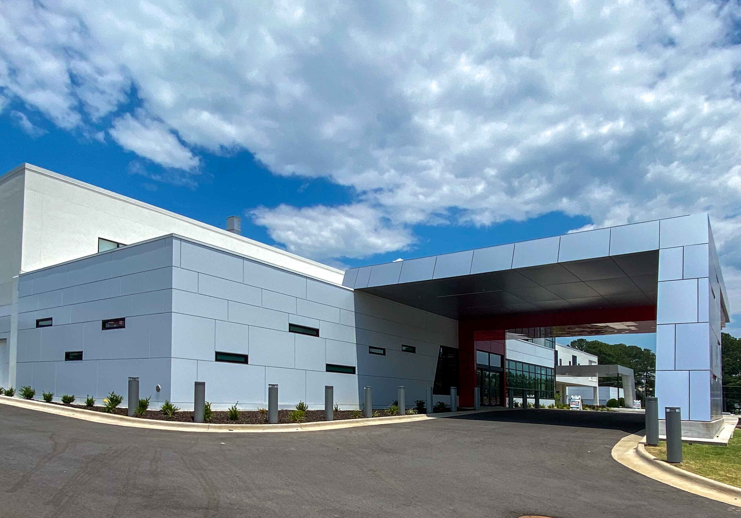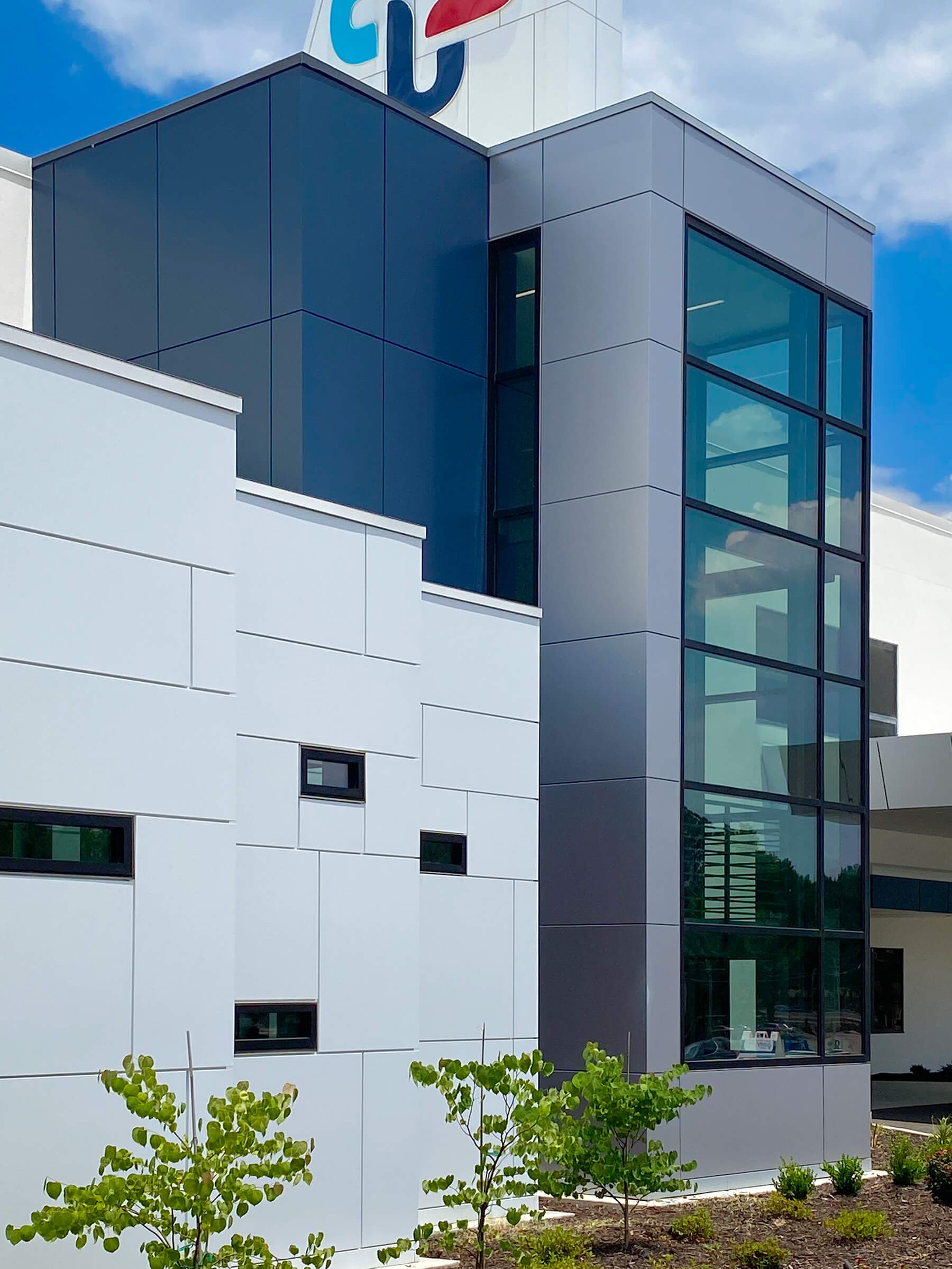 This stunning renovation of a dated medical center into a shining new state-of-the-art hospital includes Alfrex FR MCM metal composite material prominently in its design. With offset ACM panel joints, multiple colors, bump-outs, subtle angles, and tonal contrasts, fire-resistant composite metal wall panels are truly shown here at their finest courtesy of TAGGART Architects, Centerline Systems, and Ace Glass.